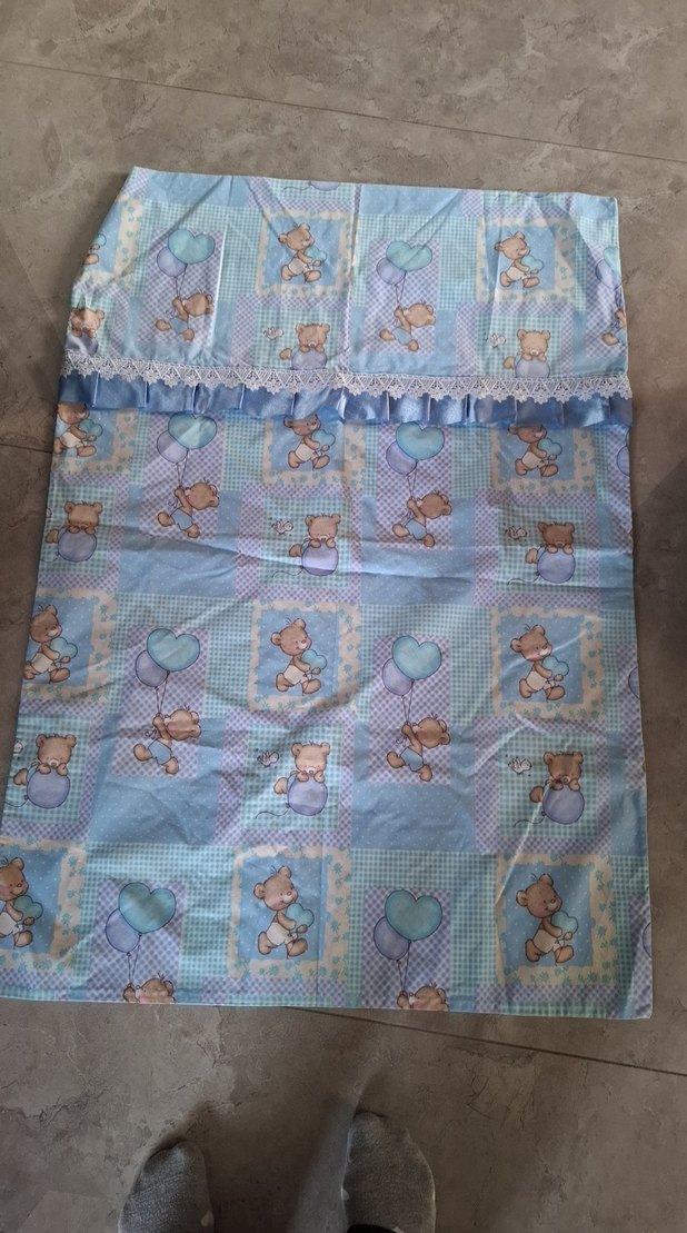 Pastel mavi renkte, baskılı ayıcık ve kalp desenli çocuk uyku örtüsü. Yumuşak sentetik kumaştan, dantel ve fırfır detaylıdır.