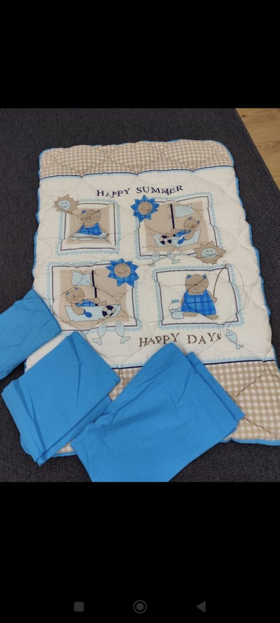 Sentetik kumaştan yapılmış, mavi tonlarında baskılı çocuk uyku seti. Üzerinde "HAPPY SUMMER" ve "HAPPY DAYS" yazıları bulunur ve uyumlu yastık kılıfları vardır. hediye geldi kullanılmadı ürün çok güzel oldukça kalın yorganı püf puf