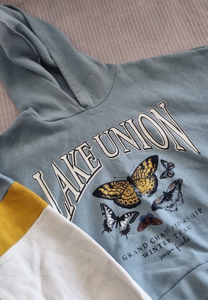 Mavi renkli, kelebek baskılı sweatshirt, kapüşonlu ve uzun kolludur. Bol kesim, yumuşak denim hissiyle günlük kullanım için uygundur. crop kısa kesimdir. hic giymedim tarzima uymadigi icin.