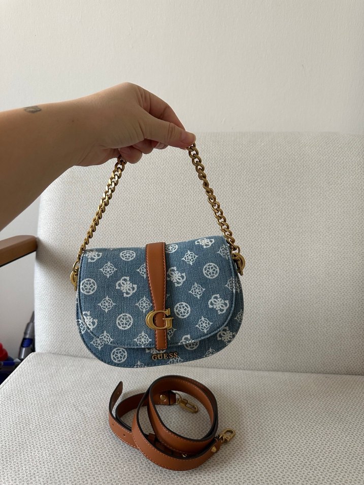 Mavi baskılı denim kumaştan, tokalı ve altın zincir saplı kadın çantası. Paris tarzı ve bohem sokak stilini yansıtıyor. ✨