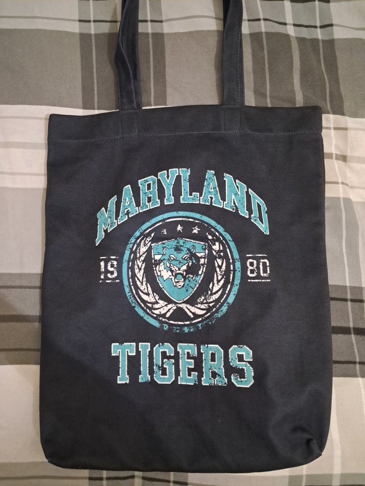 Gri denim kumaştan, mavi baskılı 'MARYLAND TIGERS 1980' yazılı kadın tote çanta.