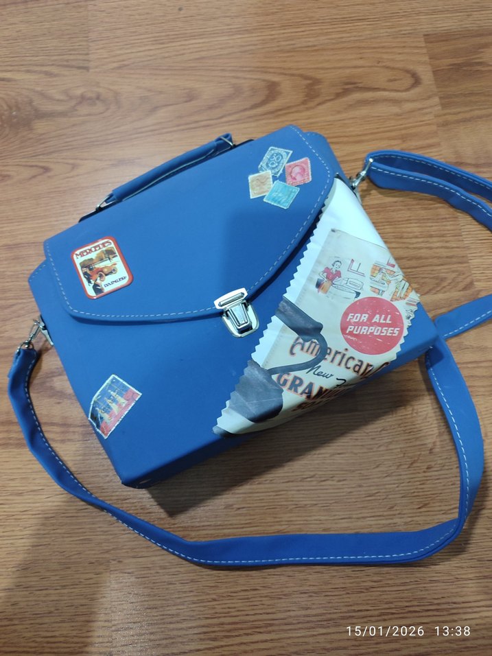 Mavi deri kadın çanta, renkli baskılar ve tokalı kapanış ile bohem ve retro tarzı yansıtıyor. Günlük kullanım için uygun.