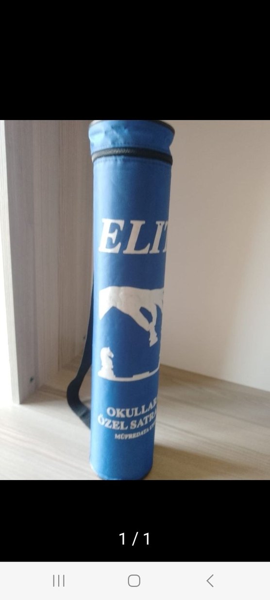 Koyu mavi renkte baskılı egzersiz matı, üzerinde "OKULLA", "ELI" ve "MOVRED" yazıları bulunur. Taşıma askısı mevcuttur.