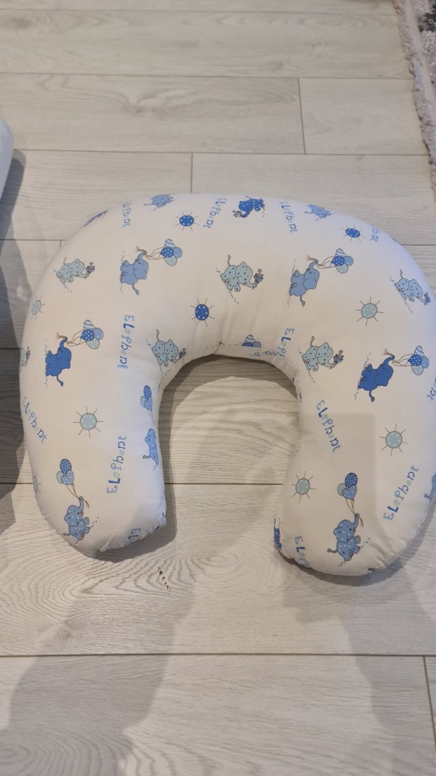 Pastel mavi renkte, fil ve güneş desenli baskılı hamilelik ve emzirme yastığıdır. Üzerinde "ElPhint" yazısı bulunmaktadır.