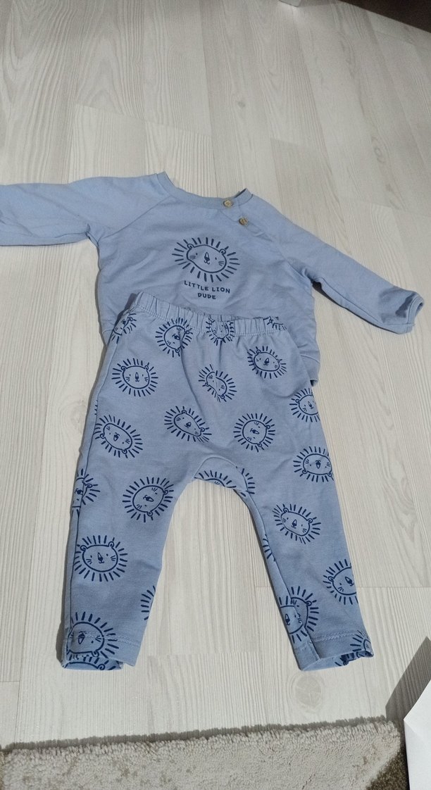 Uzun kollu, düğmeli ve bisiklet yakalı, yumuşak kumaştan mavi baskılı bebek erkek takım. Aslan desenli rahat ve konforlu model.