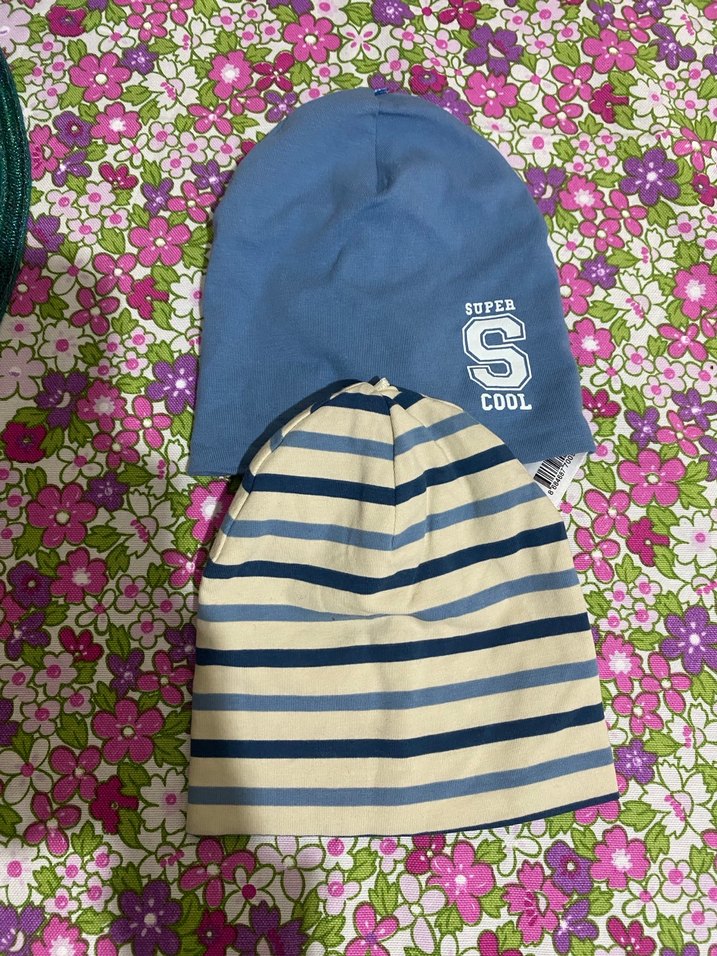 Sentetik kumaştan, biri mavi baskılı diğeri çizgili iki erkek beresi. Her ikisinde de cırt cırt detayı bulunur.