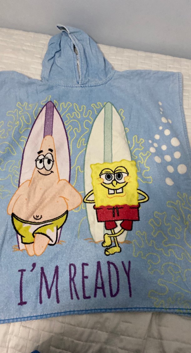 Mavi kapüşonlu bornoz, baskılı karakterler ve "I'M READY" yazısı içerir. Pastel tonlarda ve yumuşak dokuludur.