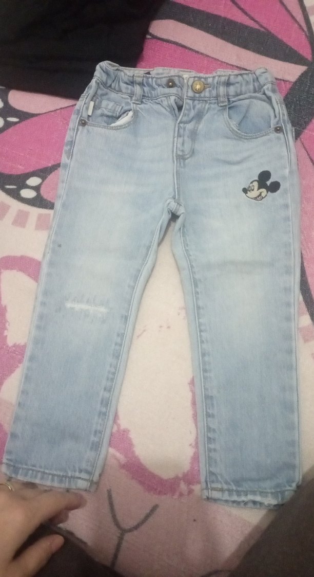 fotoda belli küçük bı lekesi var kısa bı süreliğine yukledim Düğmeli, baskılı Mickey Mouse detaylı, bol kesim mavi denim erkek çocuk pantolonu. Pastel tonlarıyla rahat ve şık bir görünüm sunar.