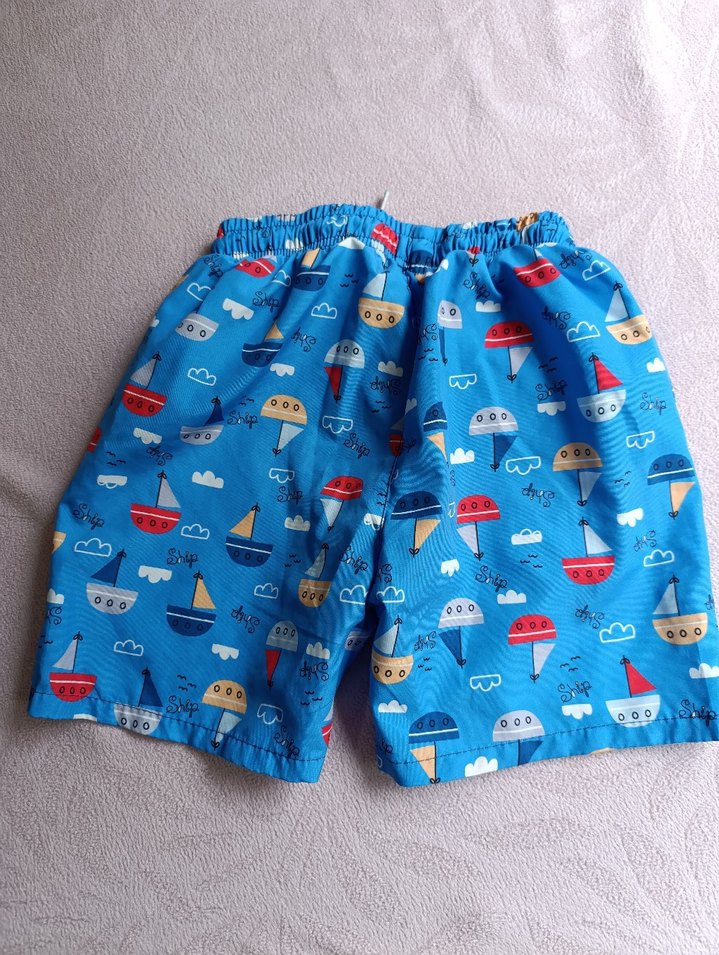 Rahat kesimli, renkli tekne desenli ve düğmeli mavi erkek çocuk şortu. Yumuşak sentetik kumaştan, elastik bel detaylıdır. ⛵