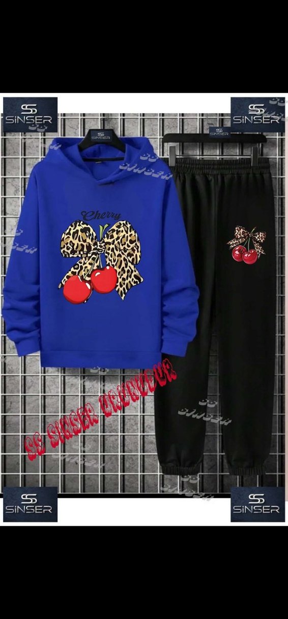 Mavi kapüşonlu ve siyah eşofman altından oluşan, kiraz ve leopar baskılı, sentetik kumaştan, bol kesim erkek çocuk eşofman takımı.