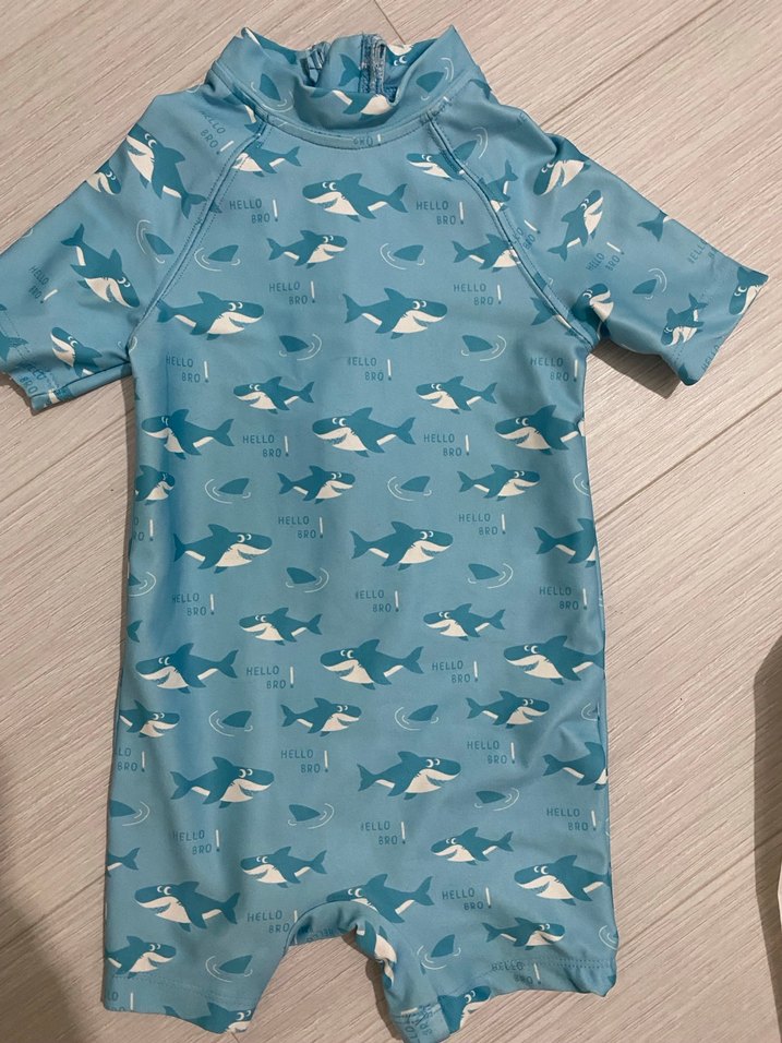 Kısa kollu, mavi-gri renkli, baskılı köpekbalığı desenli erkek çocuk mayosu. Yüzme aktiviteleri için rahat kaplama sağlar.