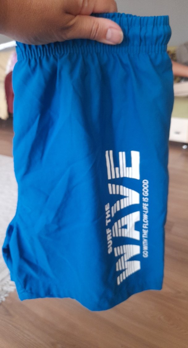 Mavi renkli, baskılı ve parlak görünümlü erkek çocuk mayo şortu. Elastik bel kısmı rahat kullanım sağlar. 12 yaş