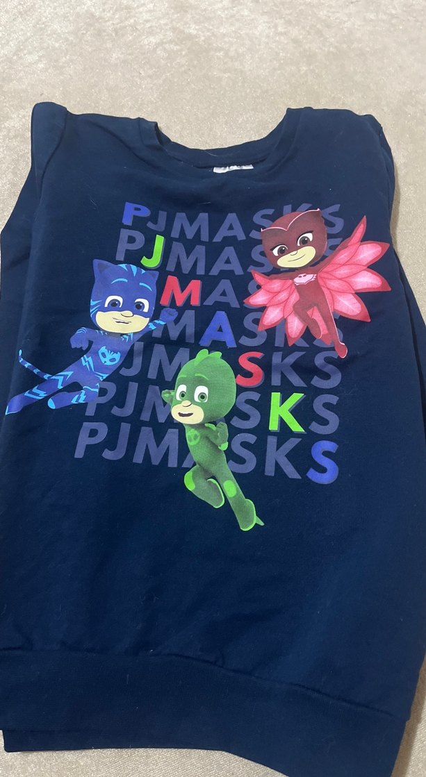 Koyu mavi renkli, baskılı karakterler içeren uzun kollu, dar kesim erkek çocuk pijama üstü.