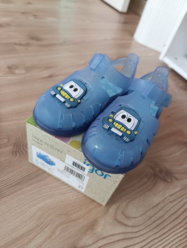Mavi renkli, baskılı araba desenli, bantlı kauçuk erkek çocuk sandaletidir. Çok az kullanıldı. 27 Numara