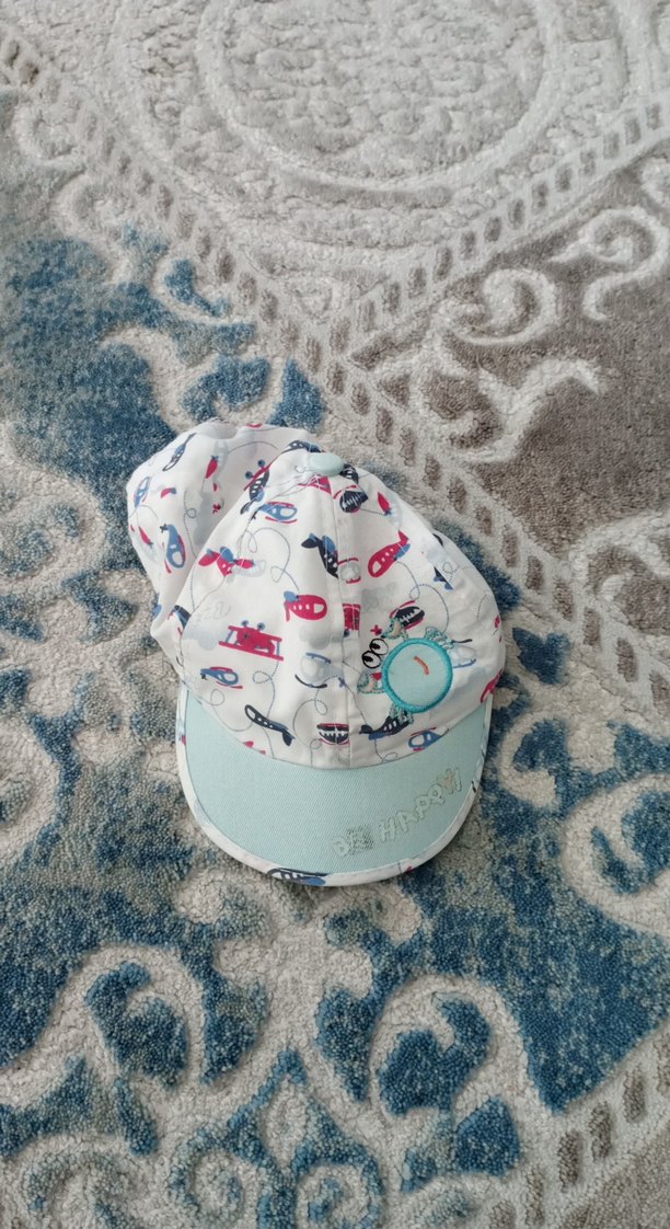 Pastel mavi tonlarında, baskılı desenli, düğmeli ve yumuşak dokulu kumaştan yapılmış erkek çocuk şapkası.