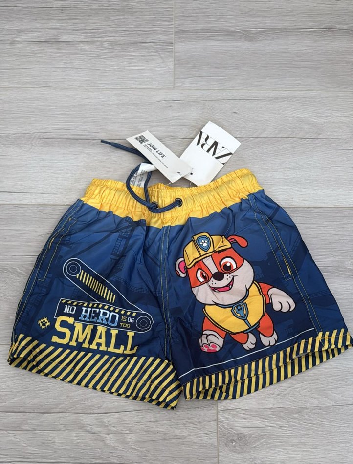 Sentetik kumaştan yapılmış, fermuarlı cepli, renkli baskılı ve dar kesim erkek çocuk şortu. Canlı çizgi karakter ve çizgili detaylarıyla trendy casual tarz için uygun. Zara deniz şortu 7-8 yaş