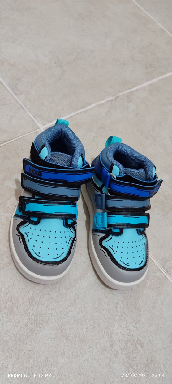 Mavi tonlarında renkli baskılı erkek çocuk spor ayakkabısı, kolay kapanan cırt cırtlı bantlara ve dayanıklı kauçuk tabana sahip. vicco marka