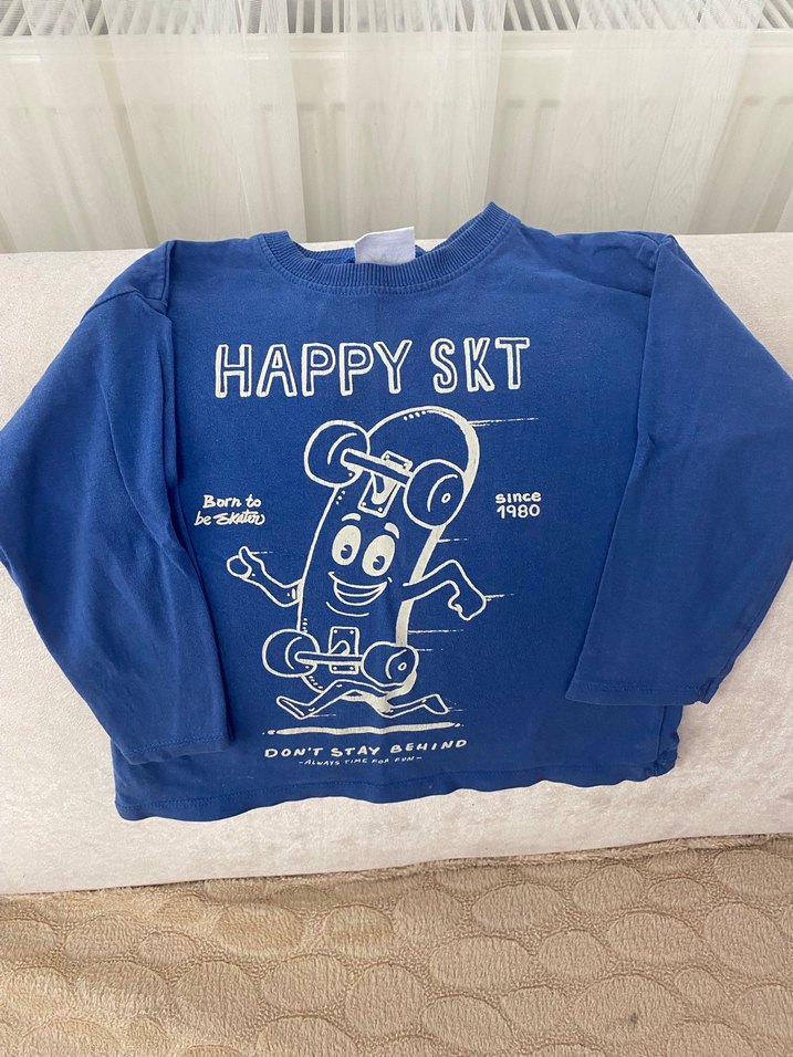 Uzun kollu, bisiklet yaka ve bol kesim erkek çocuk sweatshirtü. Yumuşak ve örme detaylı kumaştan yapılmıştır. Mavi renkli, renkli baskılı kaykay tasarımı ve "HAPPY SKT" yazısı bulunur.