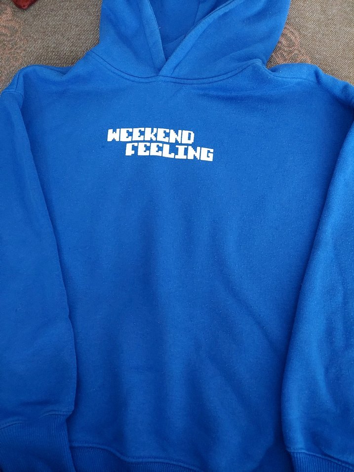 Mavi, japüsonlu, uzun kollu sweatshirt. Yumuşak, örme kumaştan ve "WEEKEND FEELING" baskılı. Günlük kullanım için uygun.Rengi görselden iki tık kötüdür.Kullanılmış üründür