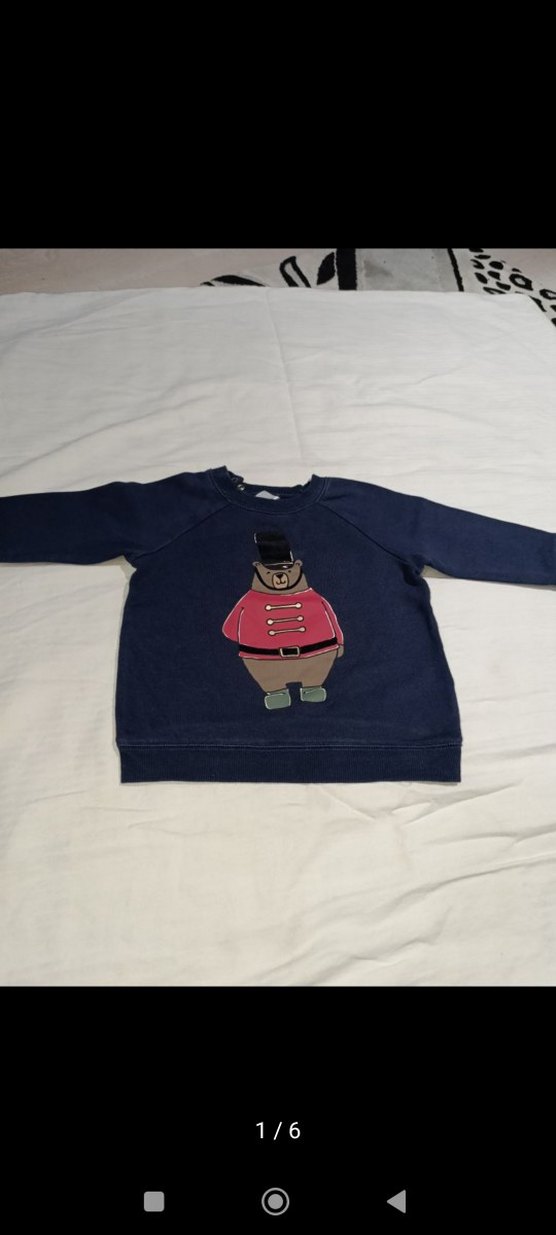 Mavi renkli, uzun kollu, bisiklet yaka erkek çocuk sweatshirtü. Yumuşak ve sıcak dokuda, bol kesim, üzerinde kırmızı kıyafetli ayı baskısı bulunur.