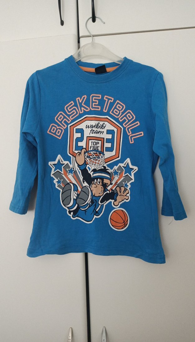 Mavi renkli, uzun kollu ve bisiklet yaka erkek çocuk sweatshirtü. Renkli basketbol baskısı ve yumuşak, örme dokulu kumaş ile rahat bir kesime sahiptir.arkada birşey değmiş ama kullanima engel değil