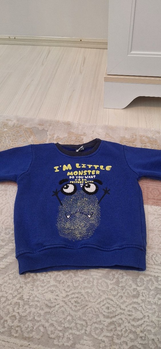 Mavi renkli, uzun kollu, bisiklet yaka ve bol kesim erkek çocuk sweatshirtü. Örme, yumuşak ve sıcak kumaştan üretilmiş, renkli baskılı canavar desenli ve "WANT" yazılıdır.