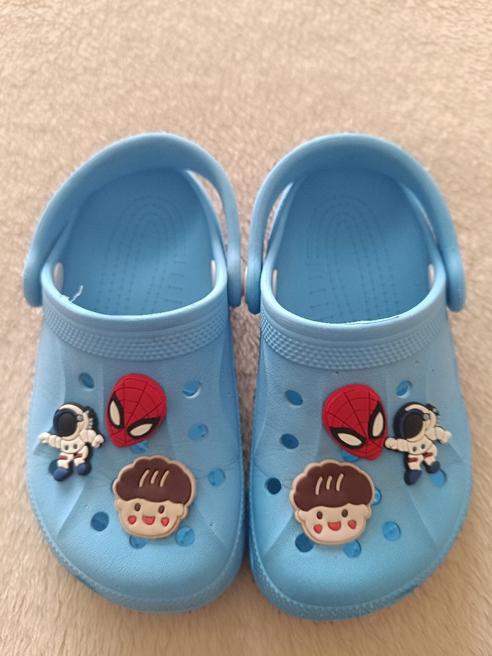 Mavi renkli, baskılı ve tokalı kayışlı erkek çocuk terliği, rahat kauçuk malzemeden üretilmiştir.