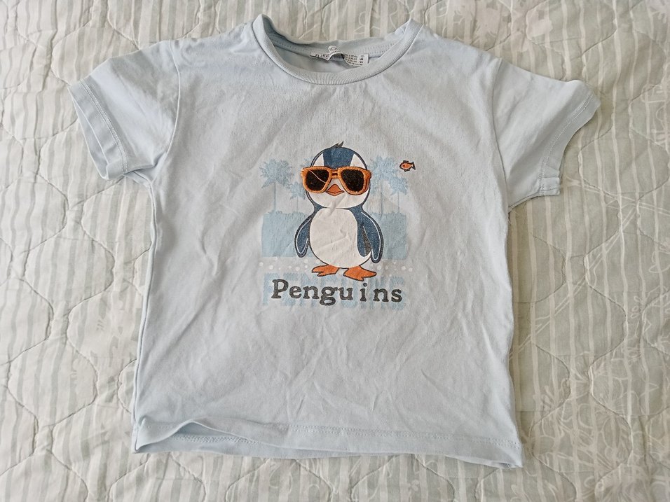 Yumuşak pamuklu, mavi baskılı, kısa kollu, salaş kesim erkek çocuk tişörtü. Önünde penguen baskısı bulunmaktadır.