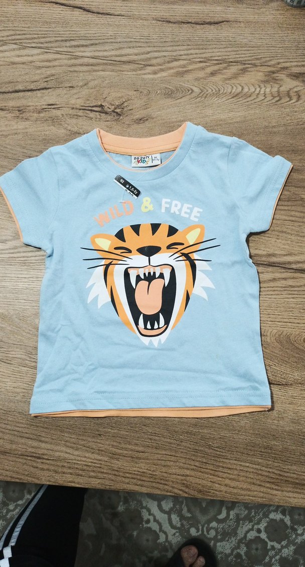 Rahat kesim, kısa kollu mavi erkek çocuk tişörtü, renkli kaplan baskısı ve 'WILD & FREE' yazısı ile. Yumuşak ve rahat kumaştan yapılmıştır.