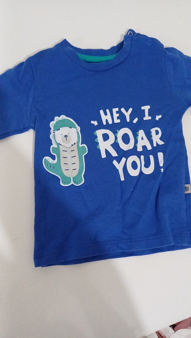 Mavi, uzun kollu, dar kesim erkek çocuk tişörtü. Yuvarlak yaka ve renkli dinozor baskısı bulunur. Yumuşak ve sıcak kumaştan yapılmıştır.