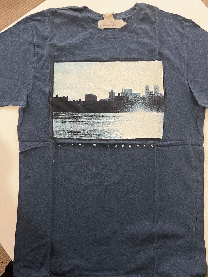 Mavi renkli, denim kumaştan üretilmiş, kısa kollu ve yuvarlak yakalı erkek tişörtü. Önünde baskılı şehir manzarası deseni bulunur, rahat ve salaş kesimlidir.
