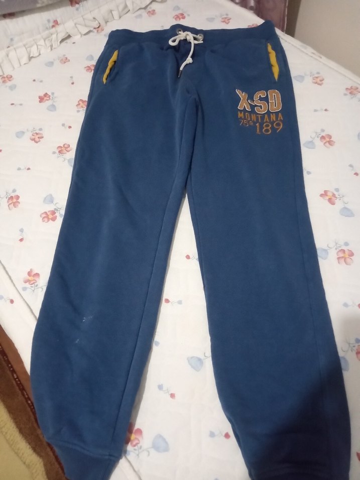 Koyu mavi renkli, baskılı ve fermuarlı cepleri olan erkek eşofman altı. Rahat kesim ve ayarlanabilir bağcıklı bel detayına sahiptir.