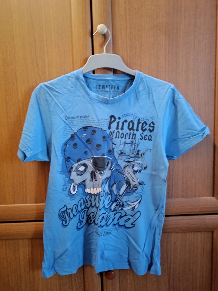Mavi denim kumaştan, baskılı korsan temalı desenli, rahat kesim ve bisiklet yaka kısa kollu erkek tişörtü. Günlük kullanım için uygundur. ☠️