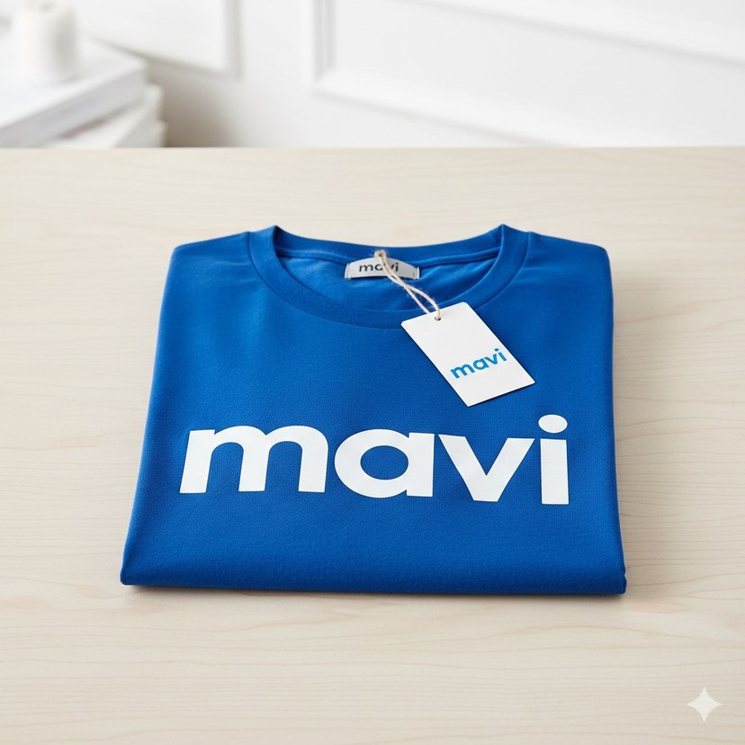 Renkli mavi tonunda, önünde 'mavi' baskısı bulunan erkek tişörtü. Yuvarlak yaka, kısa kollu ve pamuklu kumaştan, bol kesim ve cırt cırt detaylıdır.