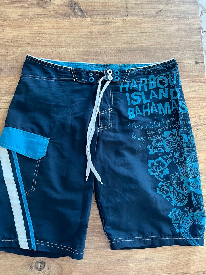 Baskılı, bel kemerli, bol kesim erkek yüzme şortu. Koyu mavi renkte, plaj için uygun, 'Bahama Island Harbour' yazılı ve çiçek desenli.
