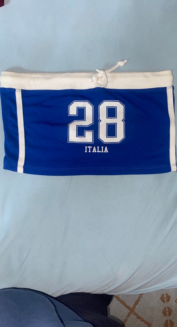 Mavi renkli, baskılı 28 numara ve "ITALIA" yazılı, kemerli ve kısa kesim, dar erkek mayo.