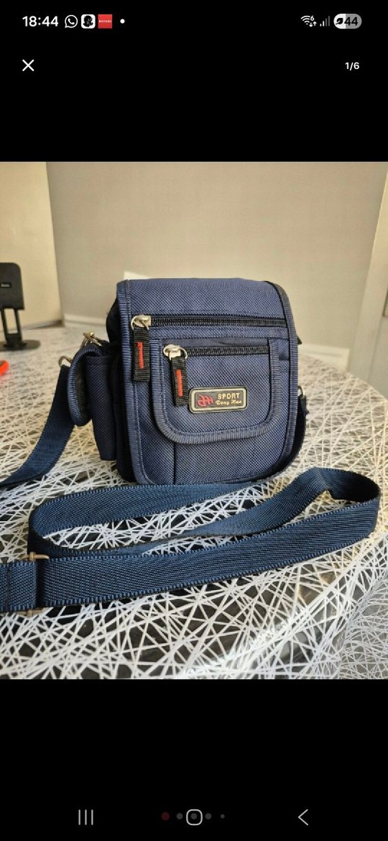 Çoklu fermuarlı cepleri ve kemerli tasarımıyla mavi baskılı erkek omuz çantası, günlük sokak stiline uygun.