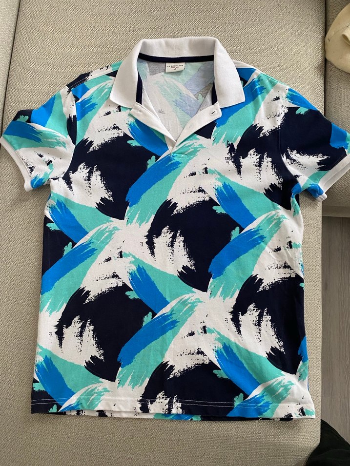 Vücuda oturan, yakalı ve kısa kollu erkek polo tişörtü, canlı mavi baskılı desene sahip. Pamuk kumaştan üretilmiştir, trend athleisure tarzına uygundur. 180 boy 75 kiloya tam oluyor.