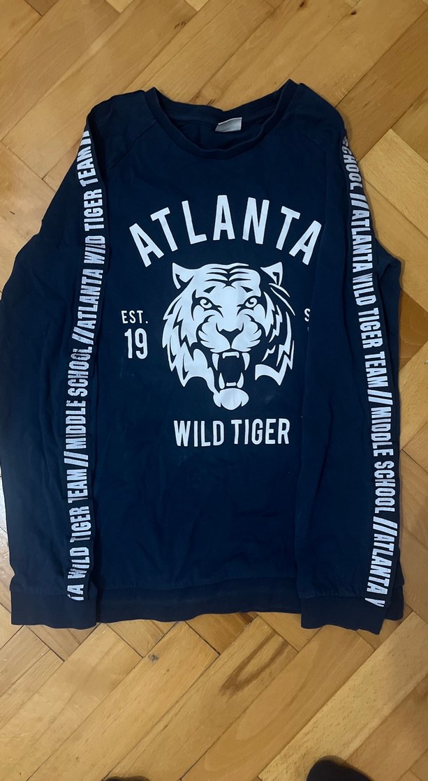 Uzun kollu, mavi sentetik kumaştan rahat kesim erkek sweatshirt, vahşi kaplan baskısı ve yazılarla rock punk tarzını yansıtıyor.