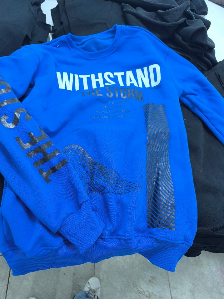 Mavi, uzun kollu, bisiklet yaka, bol kesim erkek sweatshirt. Canlı baskılar ve örme sentetik kumaşla günlük sokak stili için uygundur.