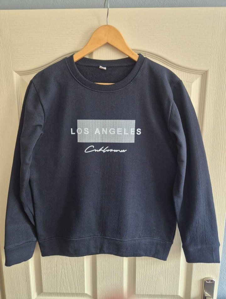 Mavi renkli, bisiklet yaka ve uzun kollu, bol kesim erkek sweatshirt. 'LOS ANGELES' baskısı ile günlük şıklık sunar. Denim görünümlü kumaştan üretilmiştir.