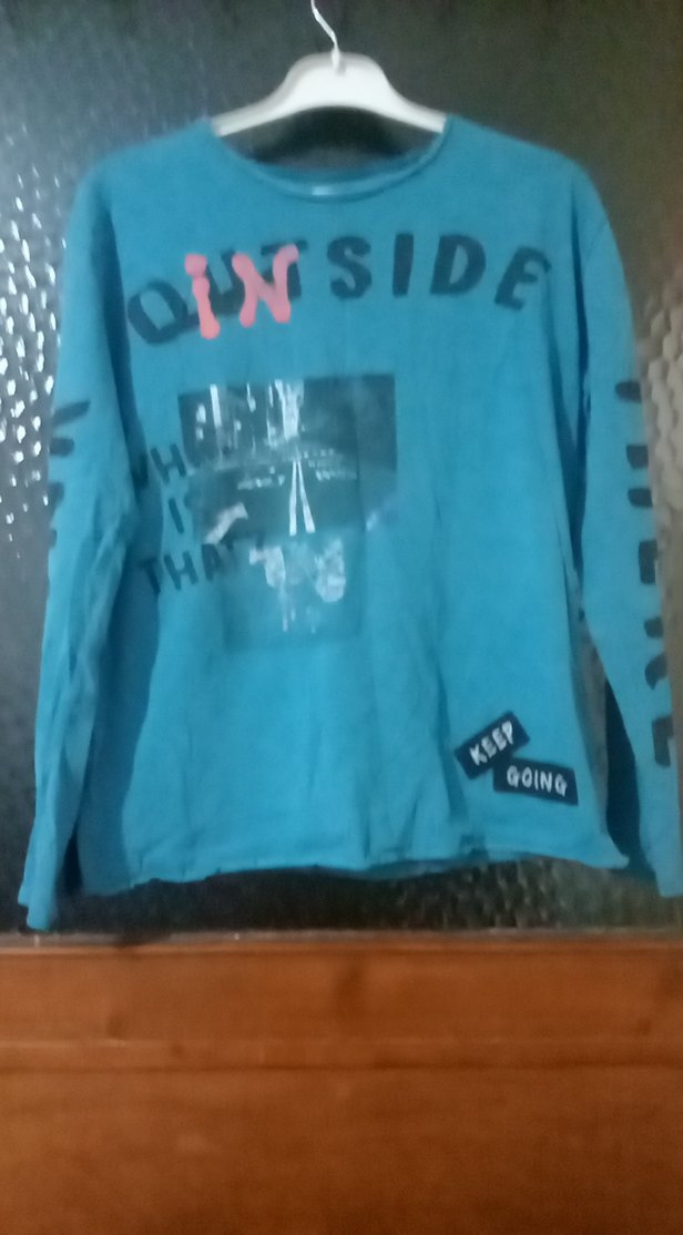 Uzun kollu, yuvarlak yakalı, bol kesim erkek sweatshirtü. Mavi renk, gri baskılı detaylar ve düğme aksesuarları içerir. Üzerinde "SIDE," "GOING," "KEEP" yazıları bulunur.
