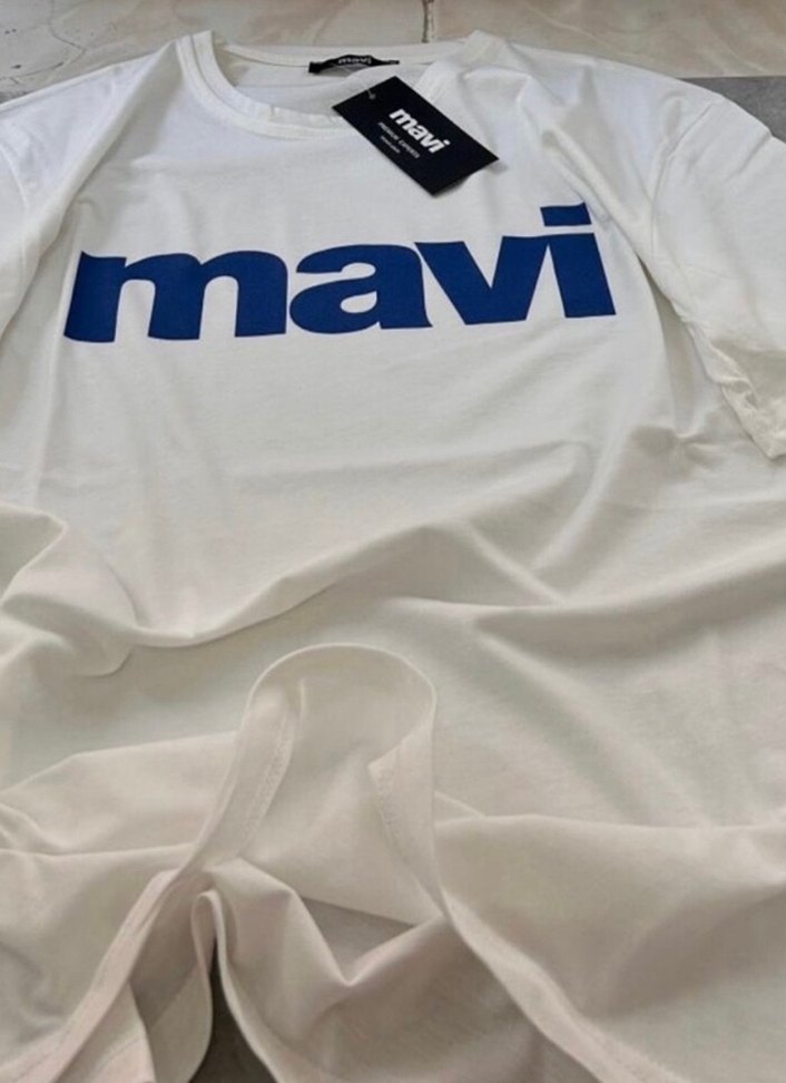 Beyaz pamuklu erkek tişörtü, önünde renkli 'mavi' baskı ile. Salaş kesim, kısa kollu ve yuvarlak yaka, rahat günlük stil için uygun.