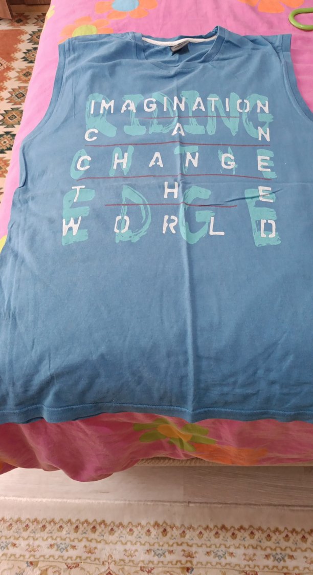 Mavi renkli, pamuklu, rahat kesim tişört Kısa kollu, yuvarlak yakalı ve baskılıdır. Günlük kullanıma uygundur.