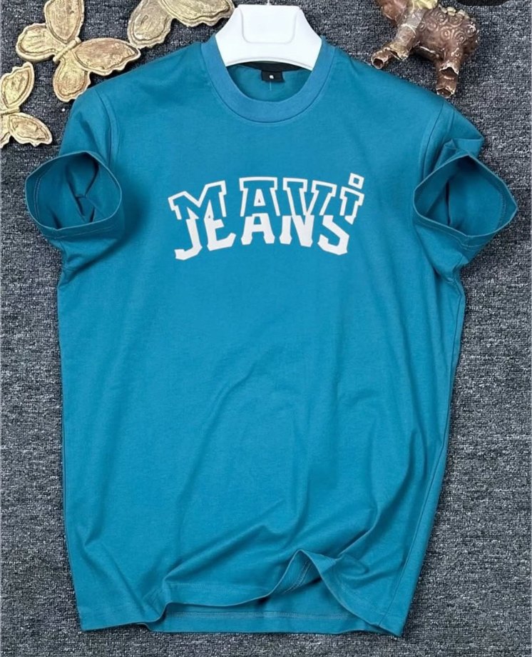 Mavi renkte, baskılı, kısa kollu, yuvarlak yaka, bol kesim erkek tişörtü. Örgü denim kumaştan üretilmiştir, günlük rahat kullanıma uygundur.