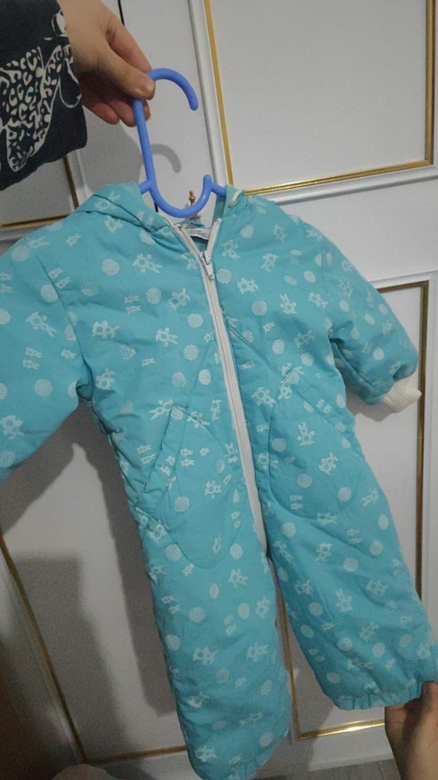Rusyadan geldi kaliteli. Pastel mavi renkli, baskılı desenli, fermuarlı ve kapüşonlu yumuşak ve sıcak kumaştan yapılmış bebek tulumu. Street wear tarzında.