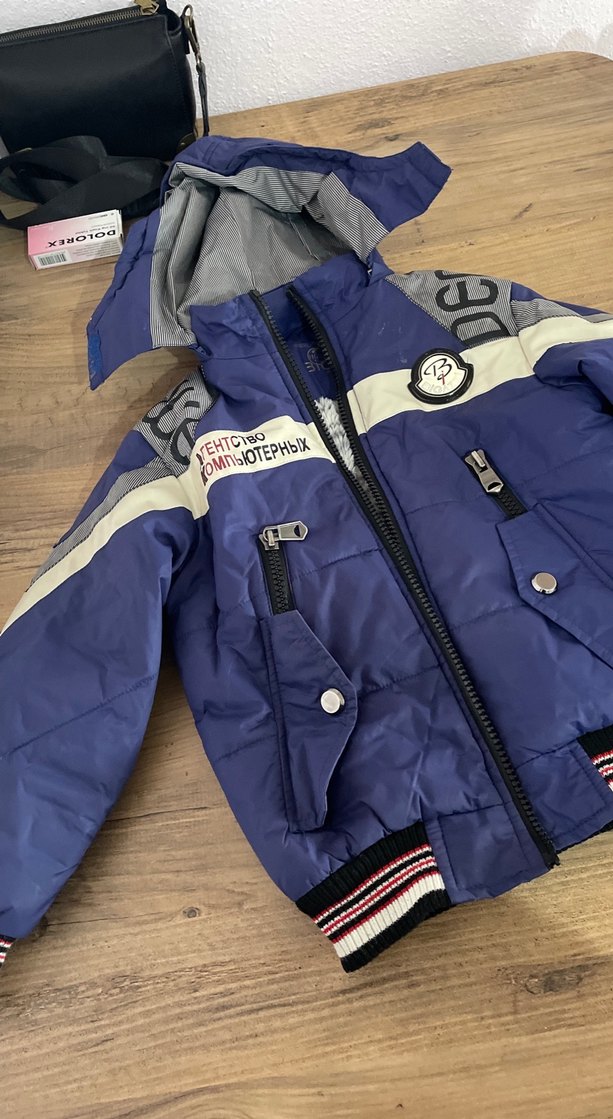 Mavi ve gri baskılı, fermuarlı, kesimli erkek çocuk montu. Notch yaka ve kapüşonlu, rahat ve sıcak kumaş. Sokak stili için uygun. ✨