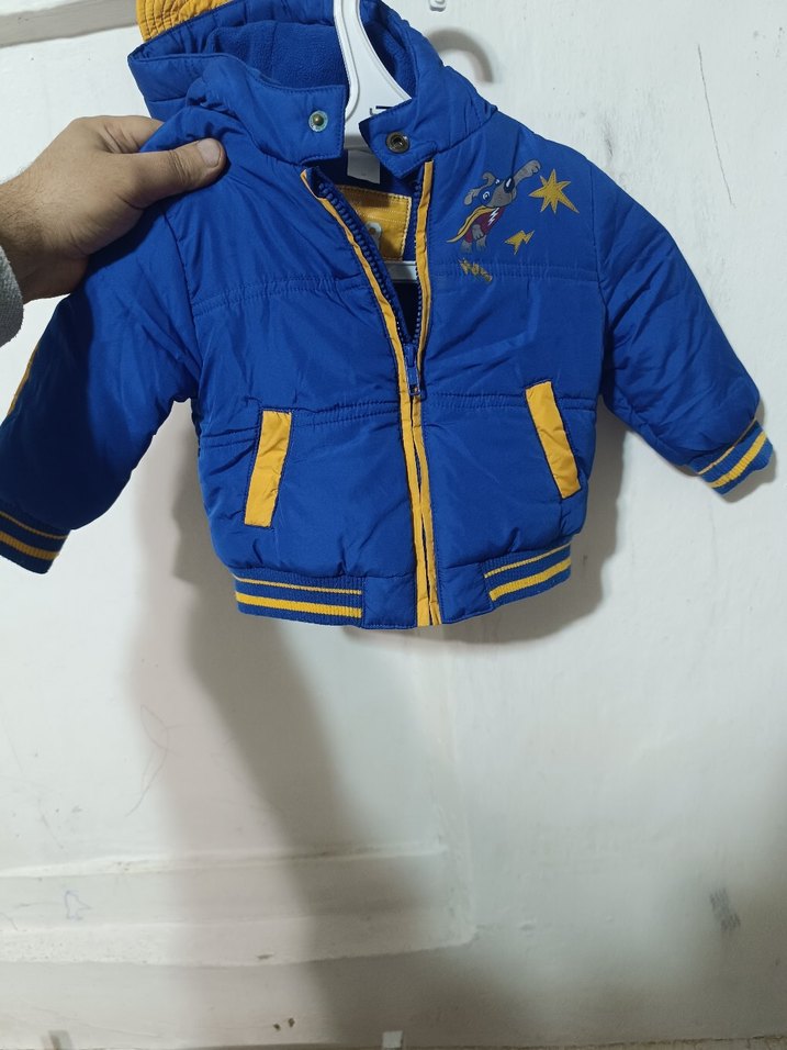 Mavi baskılı, fermuarlı ve ince kesimli erkek çocuk montu. Sarı detaylar ve çizgili manşetlerle sokak modası tarzında, yumuşak ve sıcak kumaş.