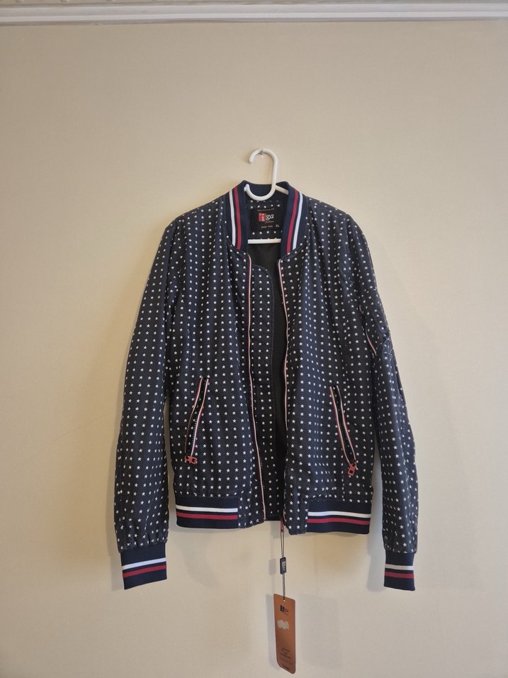 Bu kadın ceketi, fermuarlı ve uzun kollu, mavi baskılı yıldızlı desene sahip. Normal kesim ve kesik yaka ile günlük rahat kullanıma uygun. Vintage tasarıma sahip.