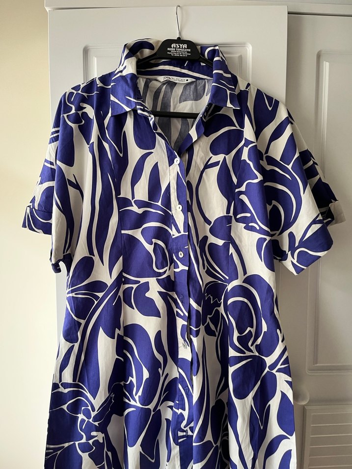 Mavi ve gri baskılı, düğmeli, yakalı, kısa kollu, uzun kesim bol hamile gömleği. Sentetik kumaştan üretilmiştir.